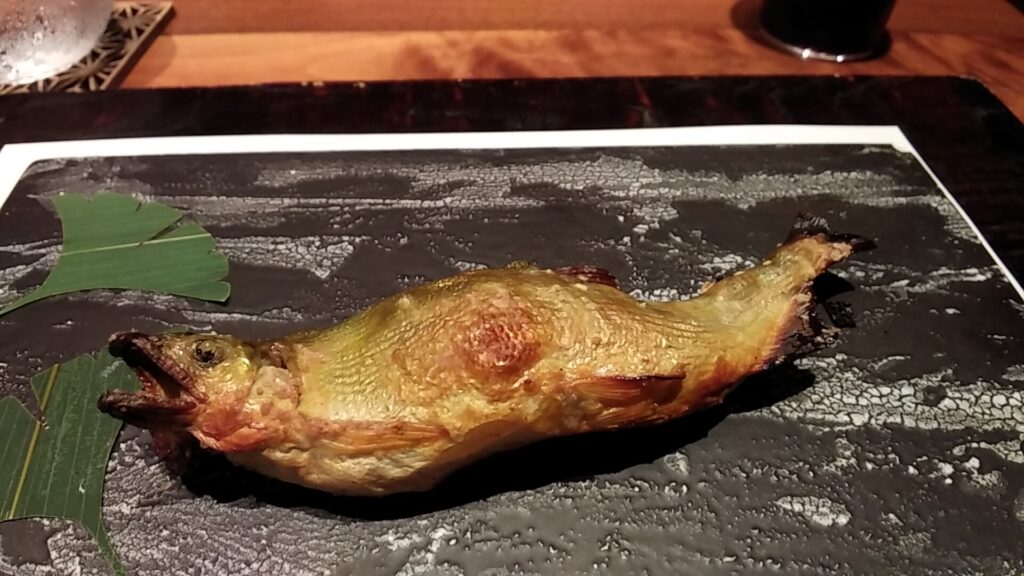고소하고 바삭하게 구워진 알을 품은 은어는 머리부터 씹어 먹을 수 있습니다.